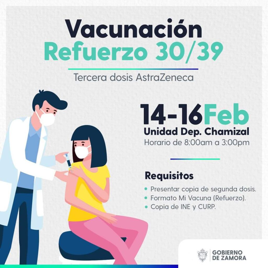 Este 14 de febrero iniciará la aplicación refuerzo de vacunación anti COVID-19 a población de 30 a 39 años de edad, sólo para personas que cuenten con su esquema completo (Sinovac, AstraZeneca, Pfizer y Cansino).