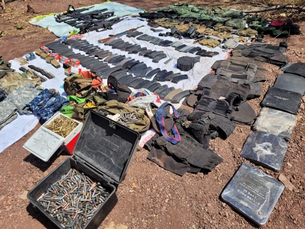 Los agresores escaparon, sin embargo, en el sitio los castrenses aseguraron 10 armas largas, 1 arma corta, cartuchos y cargadores diferentes calibres, 6 chalecos tácticos, 6 placas balísticas, diversos uniformes tácticos Militares, equipo táctico y 3 vehículos abandonados por los maleantes.