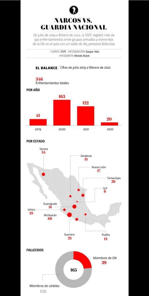 De acuerdo con un informe de la Unidad de Transparencia de la Secretaría de Seguridad y Protección Ciudadana (SSyPC), obtenido por MILENIO, en ese lapso se registraron 346 enfrentamientos entre guardias nacionales e integrantes de la delincuencia organizada en todo el territorio nacional; 41 en el 2019, 163 en el 2020, 122 en el 2021 y 20 en enero y febrero de 2022, con un saldo total de 165 fallecidos.“La Guardia Nacional se está utilizando para enfrentar a los grupos criminales mejor armados y con mejores capacidades ofensivas.