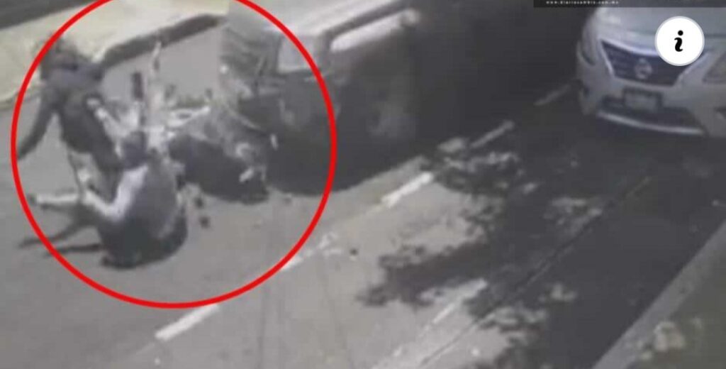 En el video se puede ver cómo los derriba en la primera ocasión, dejando la motocicleta tirada en el pavimento, lo que provoca que el conductor se detenga.