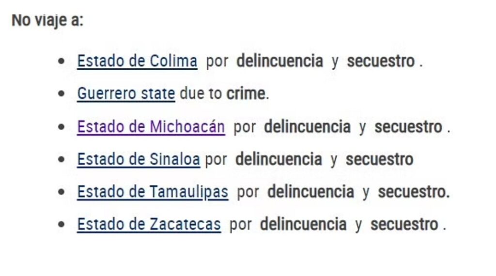 De acuerdo a la página oficial travel.state.gov, para Michoacán está la alerta vigente de no viajar «por delincuencia y secuestro».