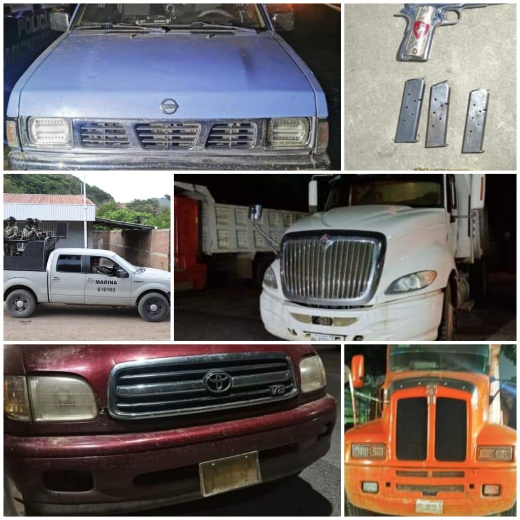 CD. LÁZARO CÁRDENAS, MICH.- Resultado del reforzamiento operativo en la zona minera de la región de Lázaro Cárdenas para evitar la comisión de delitos, personal de las secretarías de Seguridad Pública (SSP), y de Marina (SEMAR), detuvieron a 11 personas del sexo masculino, a bordo de cinco vehículos -dos tractocamiones-, los cuales contenían minerales, al parecer ilícitos; les aseguraron dos armas de fuego y equipos de radiocomunicación.