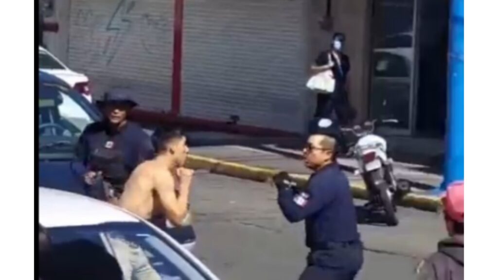 En el video se observa una pelea en la que participan al menos un policía y un joven, que no lleva playera. Otro policía está en la escena, pero sólo observa.