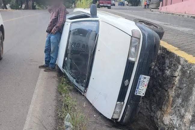 En el lugar se confirmó que estaba volcado un Nissan, Tsuru, 1993, de color blanco y una persona, aparentemente su conductor.