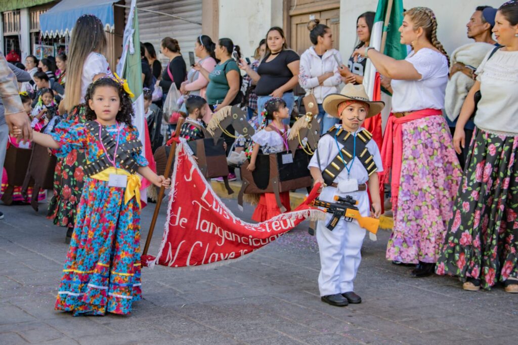 Tangancícuaro Mich.- Niñas y niños salieron a desfilar previo a la conmemoración de la Revolución Mexicana, en el cual participaron distintos planteles educativos tanto públicos como privados de nivel preescolar, durante el recorrido ya se encontraban esperando en la Plaza Municipal tanto la ciudadanía, padres de familia, asimismo Directores del H. Ayuntamiento, y el Presidente David Melgoza.
