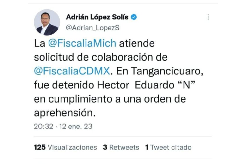 Tangancícuaro, Michoacán. – En un operativo coordinado entre la Fiscalía de Michoacán y autoridades de la Ciudad de México, fue detenido Héctor Eduardo M., presunto autor intelectual del atentado contra el periodista Ciro Gómez Leyva.