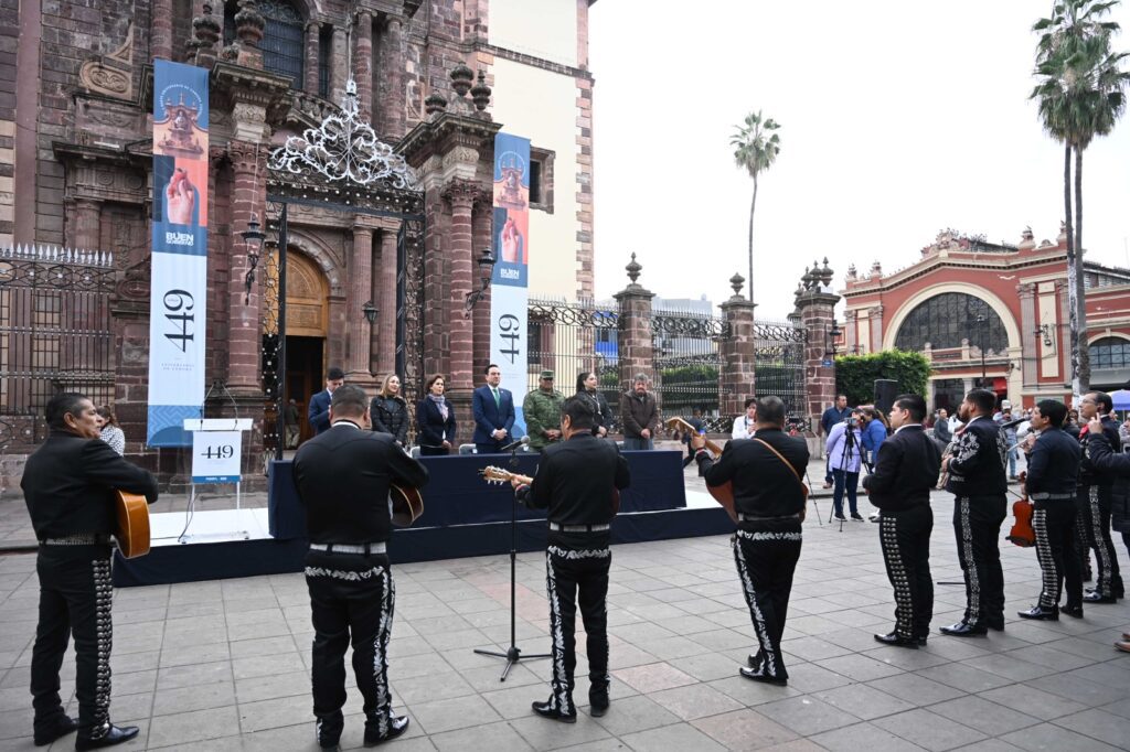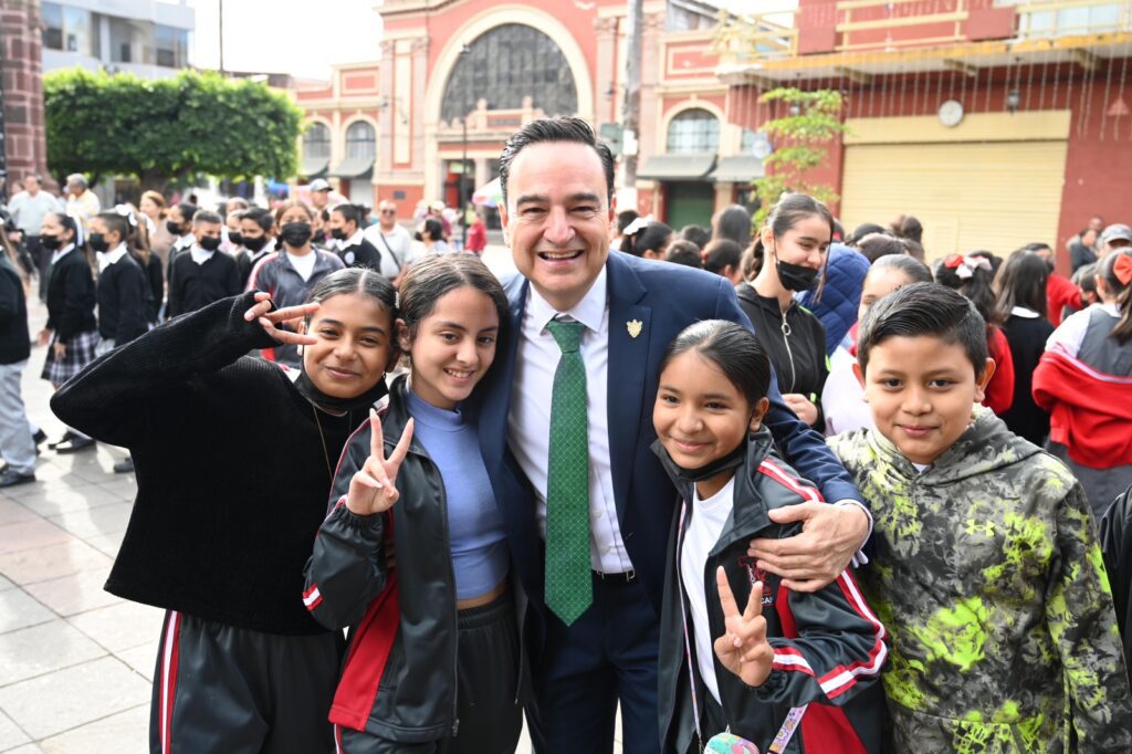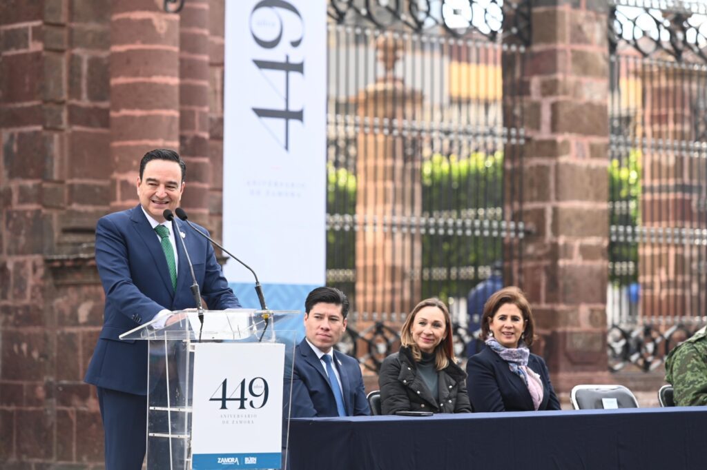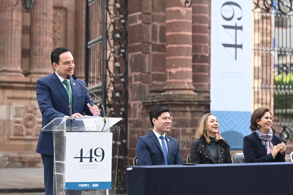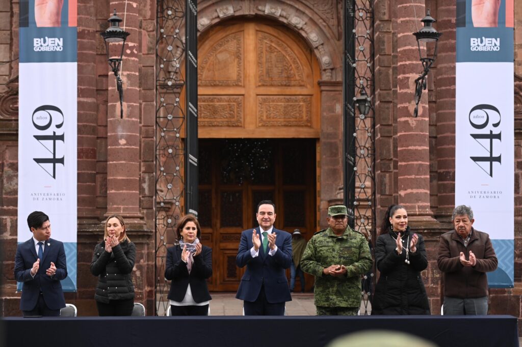 – El presidente Carlos Soto Delgado dio inicio a la celebración del aniversario 449 de la fundación oficial de la Villa de Zamora por medio de un acto cívico en la plaza principal de la ciudad.