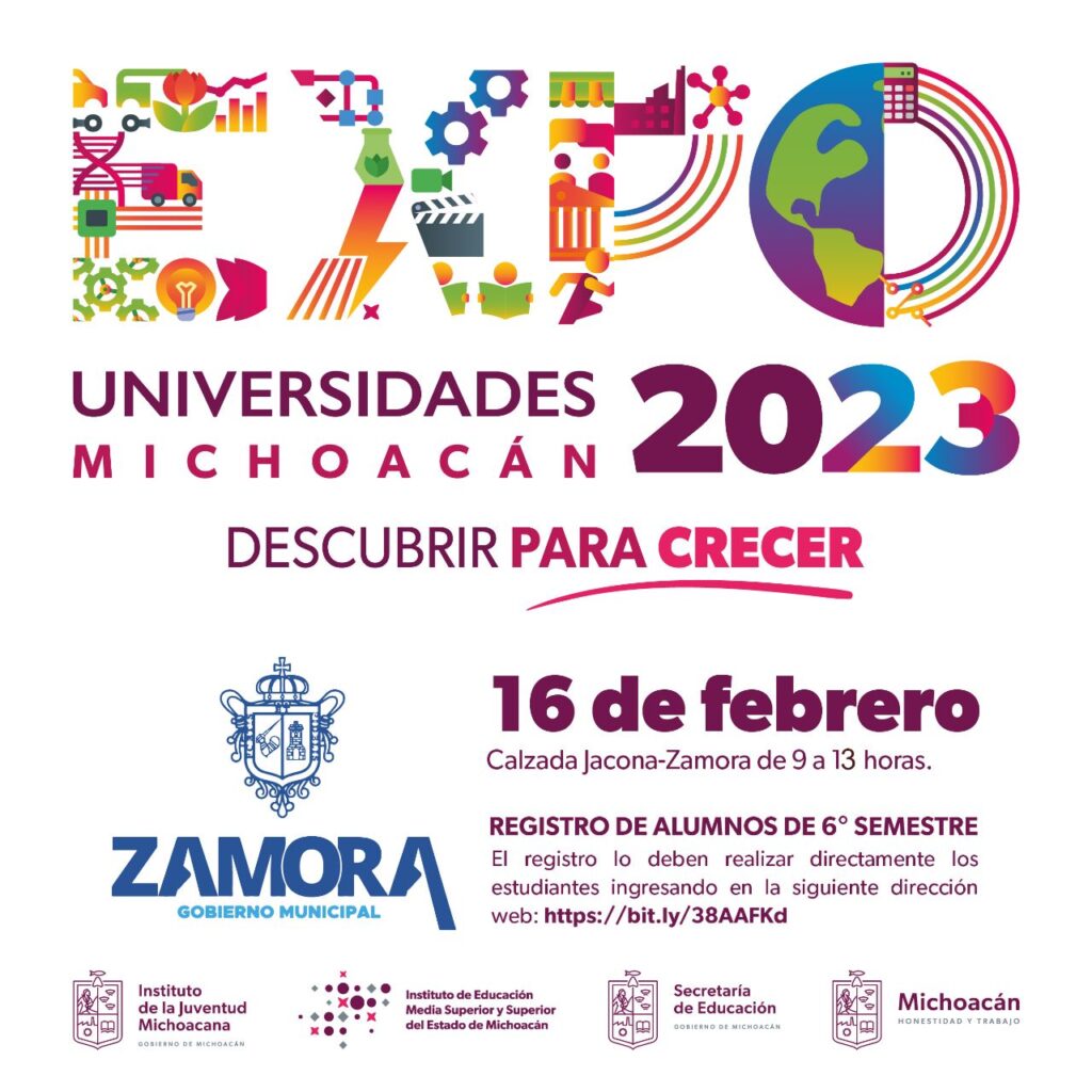 Zamora, Michoacán; a 7 de febrero de 2023.- El Ayuntamiento sumará esfuerzos con el Instituto de Educación Media Superior y Superior del Michoacán para llevar a cabo la segunda edición de la Expo Universidades 2023 “Descubrir para Crecer” que se efectuará este 16 de febrero de 9:00 de la mañana a 1:00 de la tarde, en la Calzada Zamora-Jacona, a la altura de la Rotonda de los Hombres Ilustres, con la finalidad de dar a conocer la oferta educativa que se tiene para jóvenes egresados de bachillerato.
