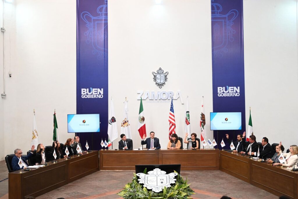 Zamora, Michoacán; a 25 de febrero de 2023.- En sesión solemne de Cabildo, el presidente Carlos Soto Delgado y los integrantes del cuerpo colegiado entregaron las llaves de Zamora a la alcaldesa, Victoria Fernández y se reconocieron como huéspedes distinguidos, a los integrantes de la Delegación de Woodland, California, que visitan el municipio en compañía de los miembros del Club Rotario de esa localidad americana, además de personalidades de Puerto de Cortés y Siguatepeque, Honduras.