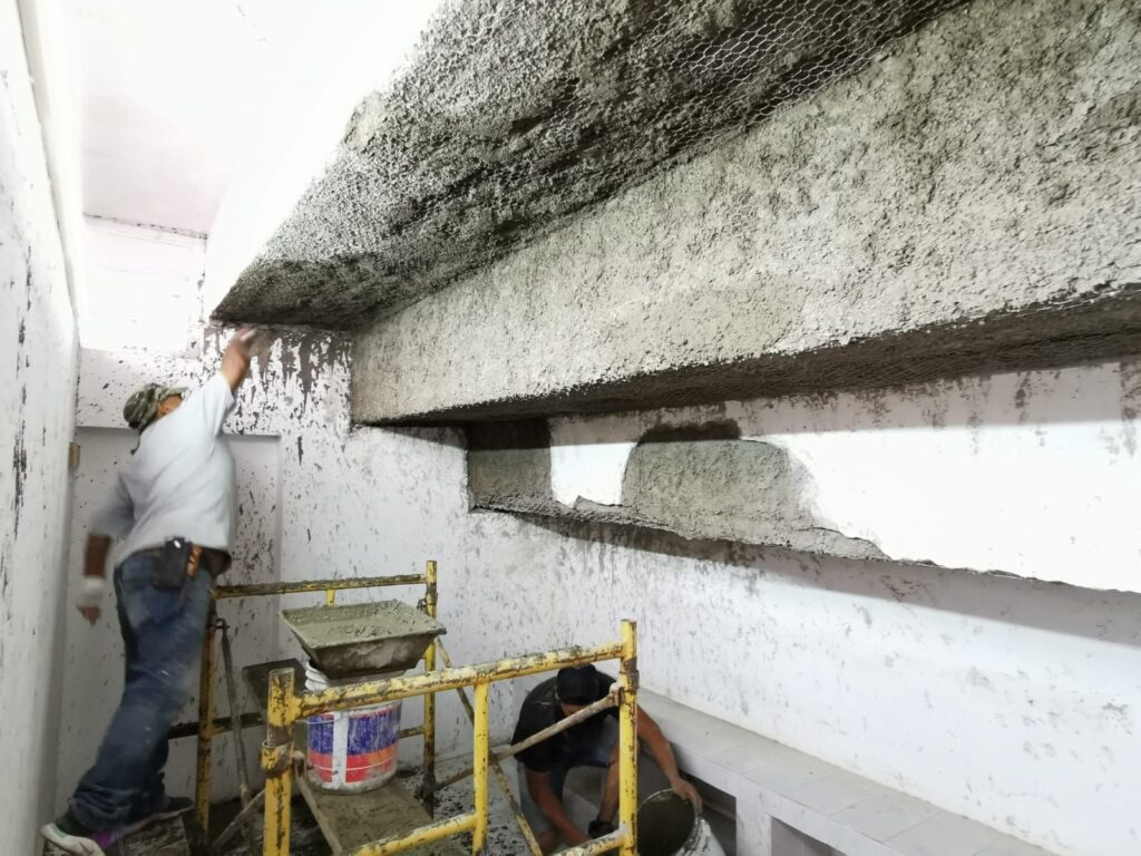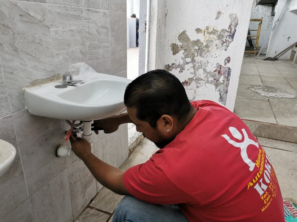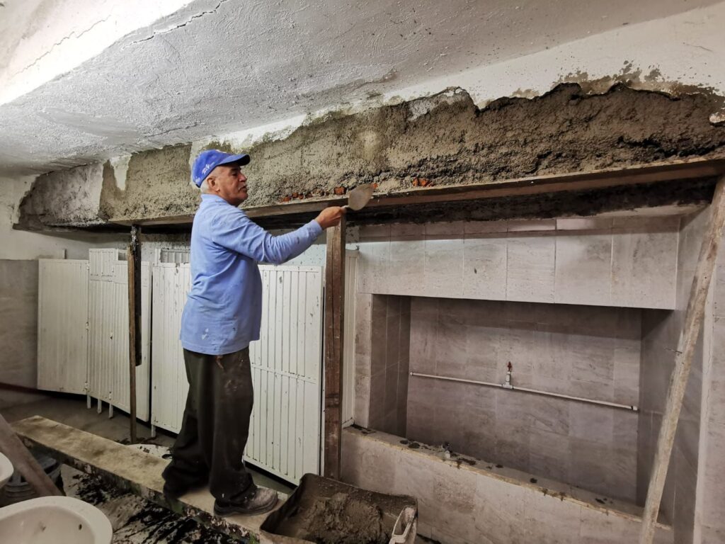 Arturo Mariscal Ochoa, director de Obras Públicas, informó que suman esfuerzos con el personal de la Unidad Deportiva “El Chamizal”, para efectuar los trabajos de rehabilitación de los vestidores, que incluyen la aplicación de enjarres en muros y graderías inferiores, la funcionalidad de las regaderas, sanitarios y tinaco, así como la instalación de las redes hidráulicas.