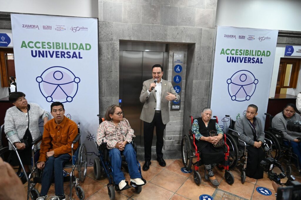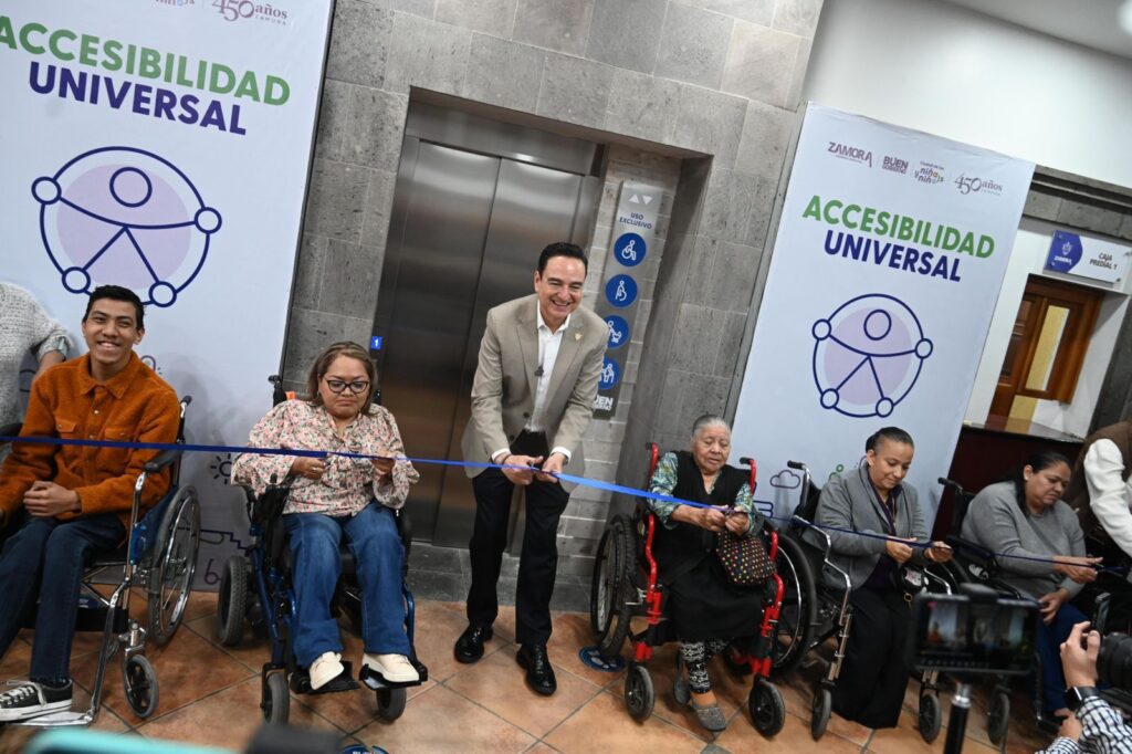 Zamora, Michoacán a 21 de febrero de 2024.- El presidente Carlos Soto Delgado e integrantes de su equipo de trabajo, llevaron a cabo la inauguración oficial del elevador instalado en el edificio de la presidencia municipal, que será de uso exclusivo para las personas con discapacidad, adultos mayores, mujeres embarazadas o ciudadanos en situación vulnerable.