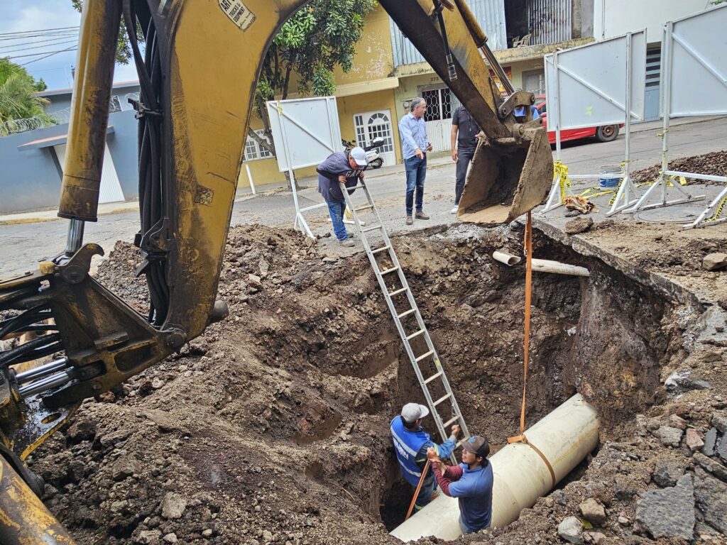 Durante la inspección se detectó que el hundimiento, de aproximadamente 2.5 metros de profundidad, fue causado por el colapso de una tubería de drenaje sanitario de 24 pulgadas. Ante esta situación, se procedió a la sustitución de seis metros lineales del tramo dañado, lo que permitió restablecer el correcto funcionamiento del sistema y asegurar la vialidad de la zona intervenida.
